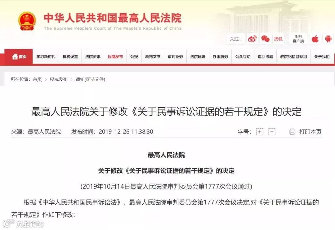 据最高人民法院官网消息,《最高人民法院关于修改<关于民事诉讼证据的若干规定>的决定》(以下简称决定)已于2019年10月14日由最高人民法院审判委员会第1777次会议通过,现予公布,自2020年5月1日起施行。
