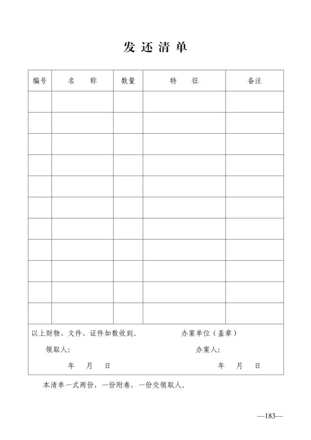 16、各类清单。“编号”栏一律采取阿拉伯数字,按材料、物品的排列顺序从“1”开始逐次填写。“名称”栏填写材料、物品的名称;“数量”栏填写材料、物品的数量,使用阿拉伯数字填写;“特征”栏填写物品的品牌、型号、颜色、新旧等特点。表格多余部分应当用斜对角线划掉。