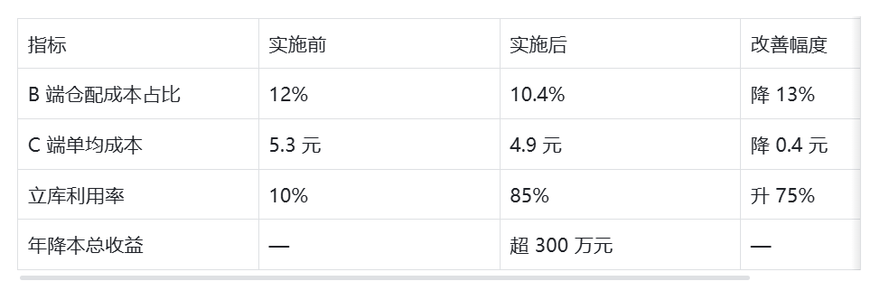 仓储成本占营收比例从 12% 降至 8.5%,年节约成本超 300 万元。