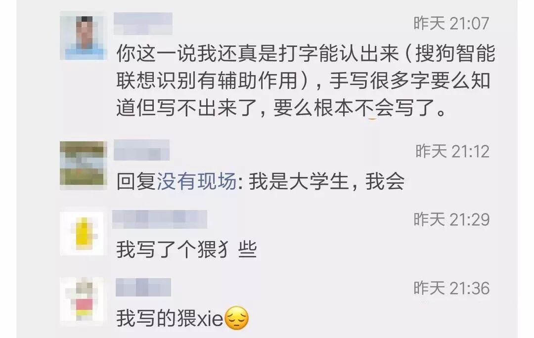 在这个信息化的时代里,我们工作生活的大部分都依赖电脑和手机,输入法是如此的快捷和方便,只要输入“WX”,“猥亵”就跃然纸上了,何需搜肠刮肚苦苦思索。这种改变平常未曾注意,想写个东西,第一反应,手指便伸展开来,食指自动放在了“F”键和“J”键上了,笔是怎么拿的反倒要想一想了。