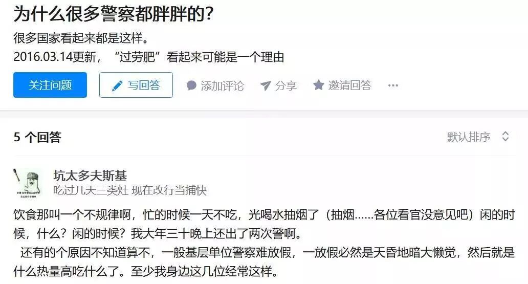 知乎的回答,显然专业了很多。而且问话也更全面,的确,不仅仅是中国,很多国家的警察,都是这样。这个问题下面一共有5个答案,全部着眼与饮食作息不规律这个职业特点。