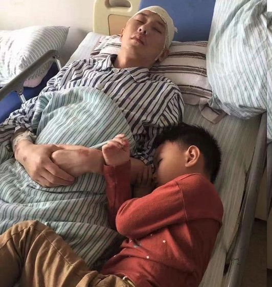 有一张照片特别让人动容:肖世奇躺在病床上,儿子蜷缩在他身边熟睡。