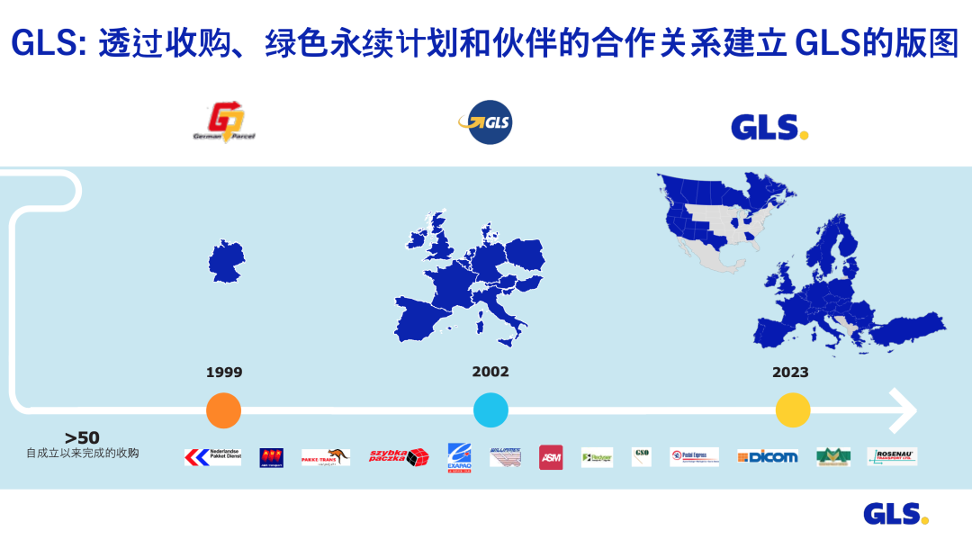 到2002年,GLS通过在多个国家收购和成立子公司建立了庞大的泛欧包裹网络,合并推出了General Logistics Systems(GLS)品牌。此后,GLS逐步引入了质量管理体系,进一步扩展旗下网络,并构建了高效可靠的IT服务体系。