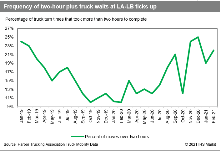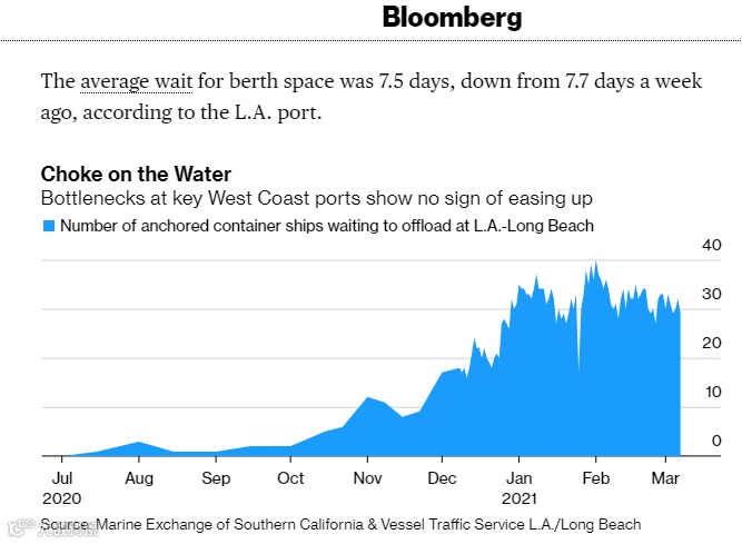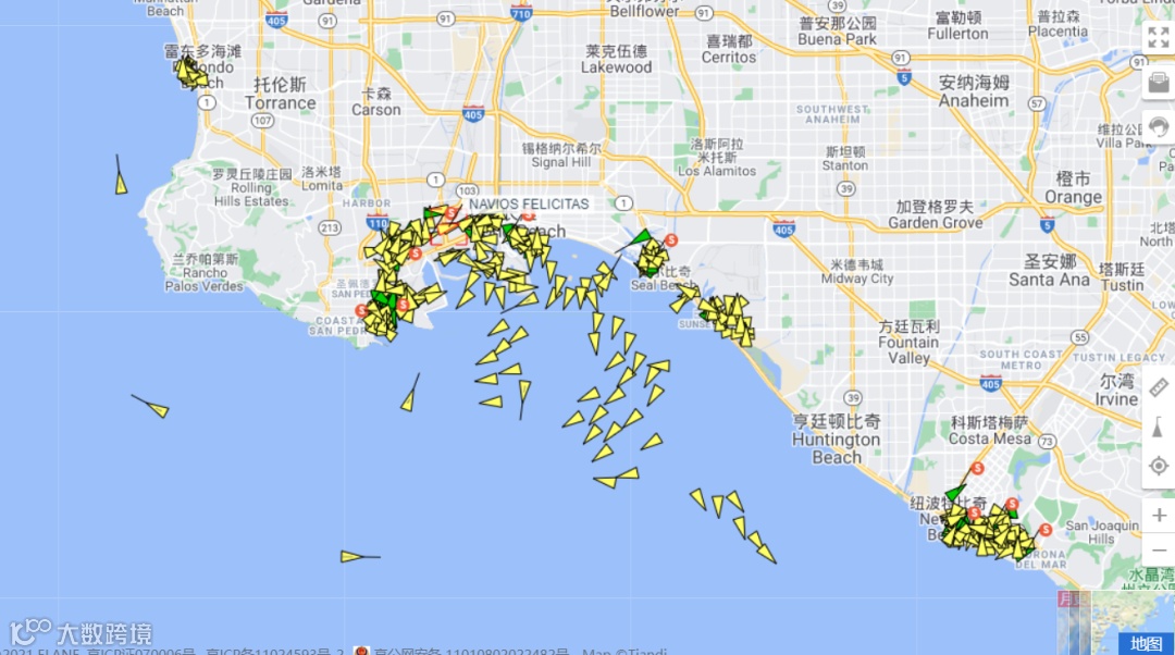 近几月停泊在洛杉矶、长滩等待卸货的集装箱船数量