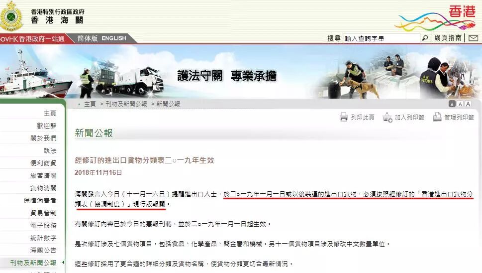 据香港特区政府网消息,香港海关发言人提醒进出口人士:2019年1月1日起,装运的进出口货物,必须按照最新修订的《香港进出口货物分类表(协调制度)》报关。