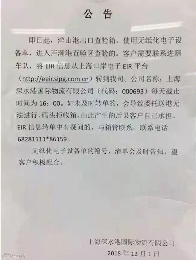 自12月1日起,洋山港出口查验箱,将使用无纸化电子设备单,进入芦潮港查验区,客户需联系进箱车队,将EIR信息从上海口岸电子EIR平台(http://eeir.sipg.com .cn)转入上海深水港国际物流有限公司,每天截止时间为16:00,请及时转单,EIR信息中有疑问的,请联系68281111*86159。