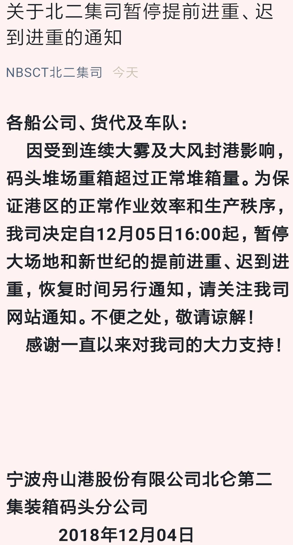 因受到连续大雾及大风封港影响,码头堆场重箱超过正常堆箱量。为保证港区的正常作业效率和生产秩序,我司决定自12月05日16:00起,暂停大场地和新世纪的提前进重、迟到进重,恢复时间另行通知,请关注我司网站通知。不便之处,敬请谅解!