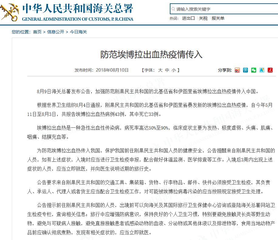 8月9日海关总署发布公告,加强防范刚果民主共和国的北基伍省和伊图里省埃博拉出血热疫情传入中国。