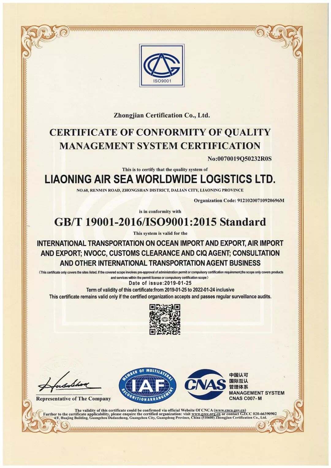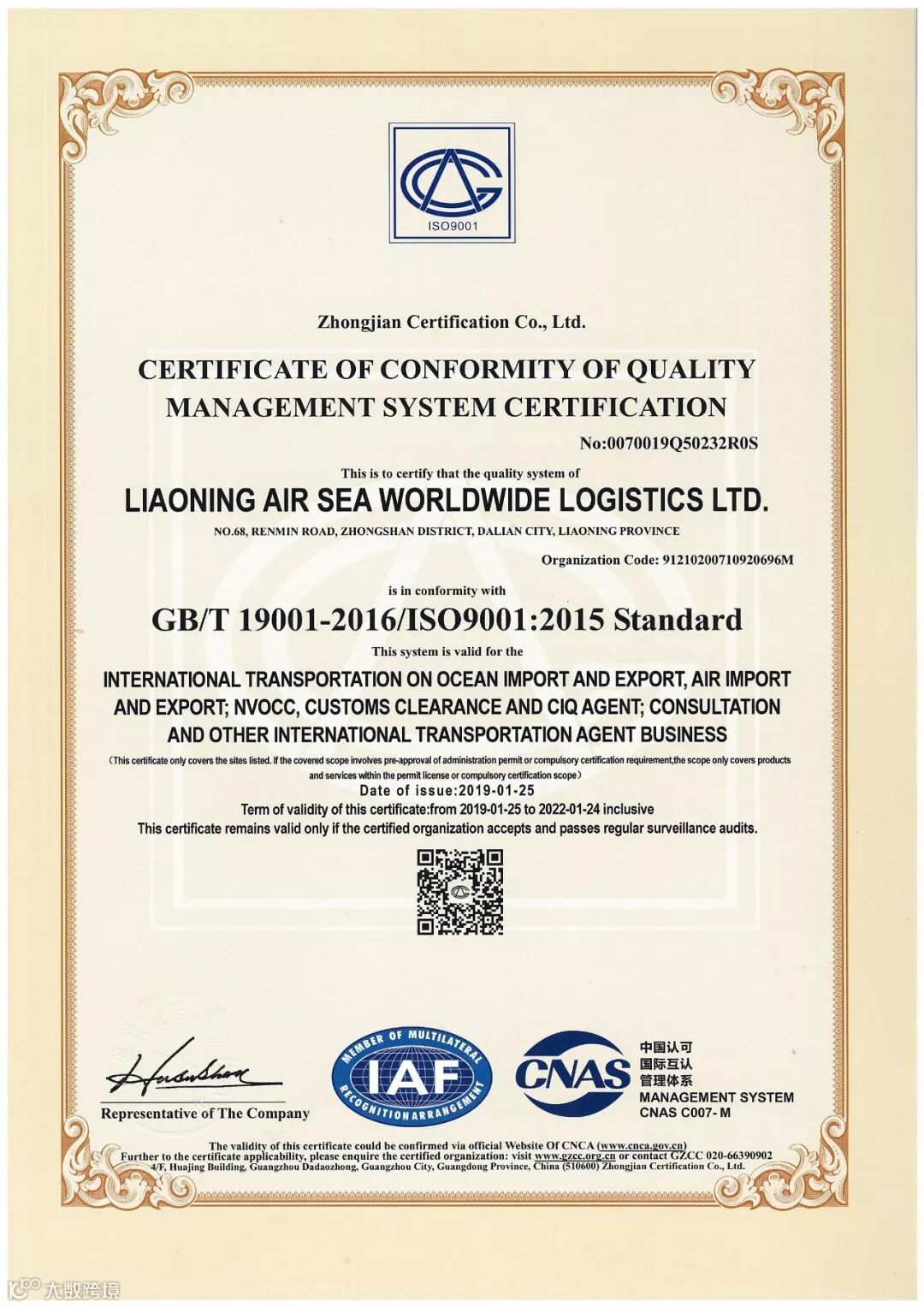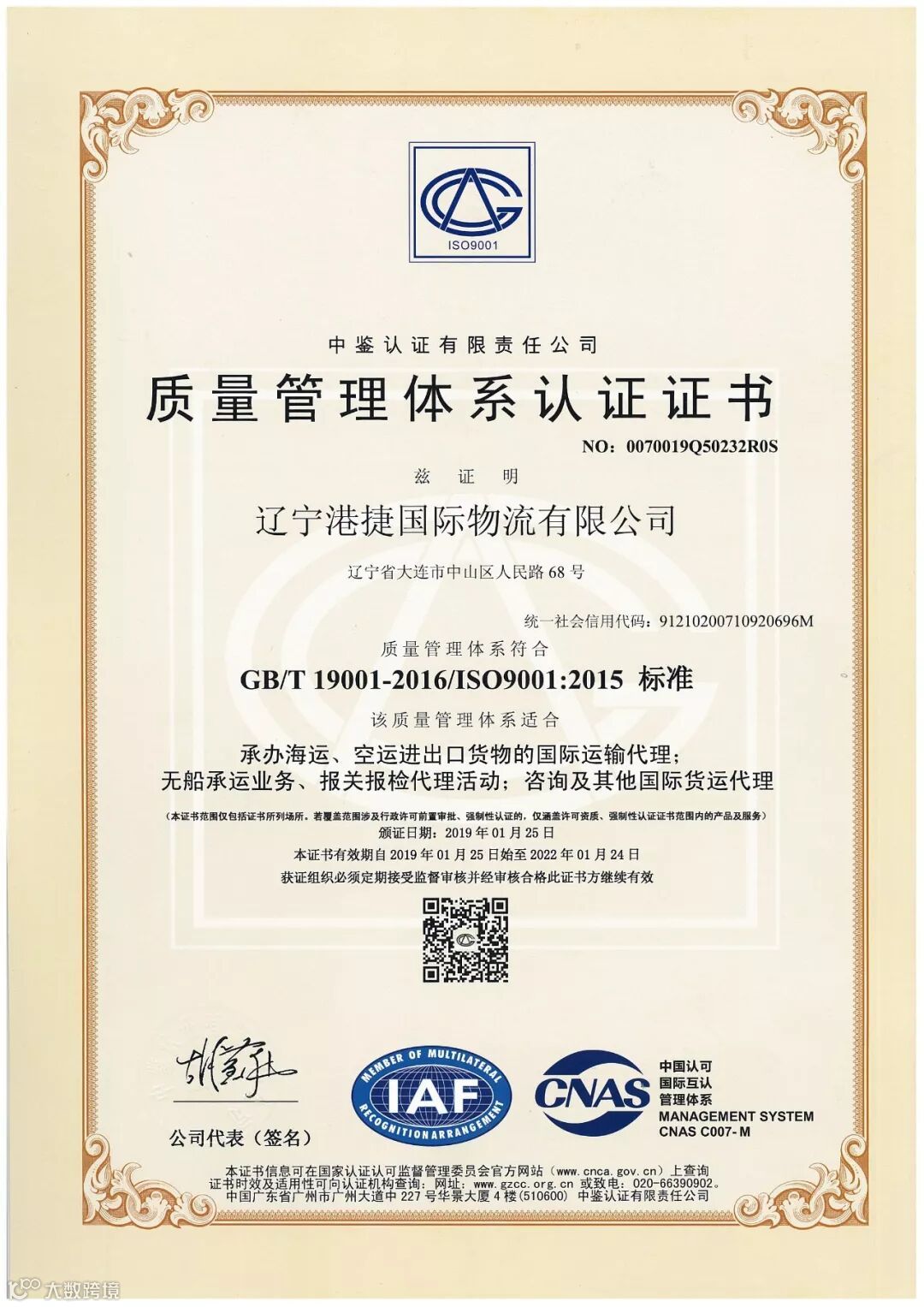 辽宁港捷国际物流有限公司成功获得ISO9001质量管理体系认证书,管理体系符合GB /T 19001-2016/ISO9001:2015标准,ISO9001是建立竞标业务和国际公司的一般业务的重要工具,同时间,亦证明我司的内部管理,控制业务风险和财务风险已达到一定的认可水平。此质量管理体系适合于我司承办海运、空运进出口货物的国际运输代理; 无船承运业务、报关报检代理活动; 咨询及其他国际货运代理,绝对是国际货运行业最佳合作伙伴。