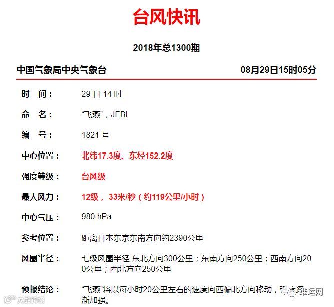 今年第21号台风“飞燕”(热带风暴级;英文名称:JEBI;名称来源:韩国;名称意义:燕子)今天(28日)上午在西北太平洋洋面上生成。目前位于距离日本东京东南方向约2390公里。“飞燕”将以每小时20公里左右的速度向西偏北方向移动,强度逐渐加强。未来极可能加强成为超强台风,近中心风速达16级。