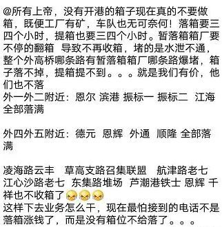 每个星期都来一个台风,船大量晚开,码头的柜子无处堆放。落箱费更是暴涨,甚至有钱还不一定有地方能落箱!