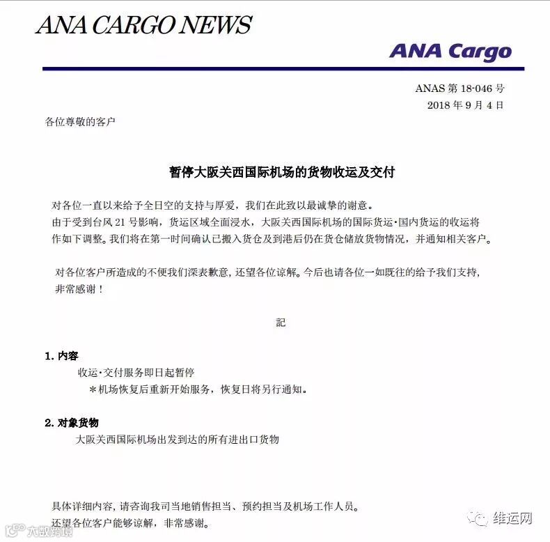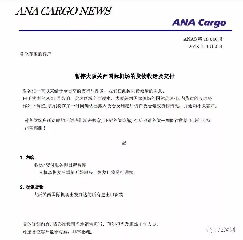 由于日本受到21号台风影响,NH即日起暂停大阪关西国际机场的进出港货物收运 ・交付服务。