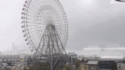 连摩天轮都被强风吹的转起来,平时转一圈需要17分钟,在狂风中,转一圈仅需20多秒。