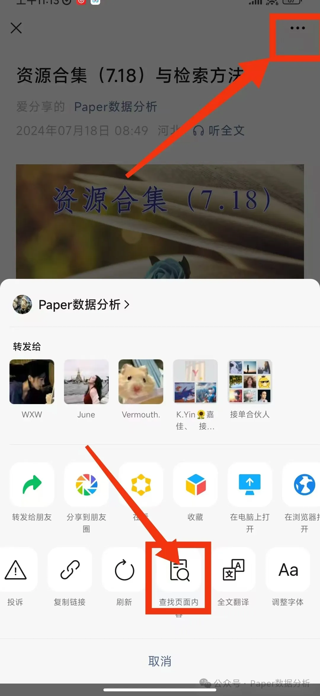第二步:点击右上方的三个小圆点,并搜索页面内容,输入需要搜索的关键词即可