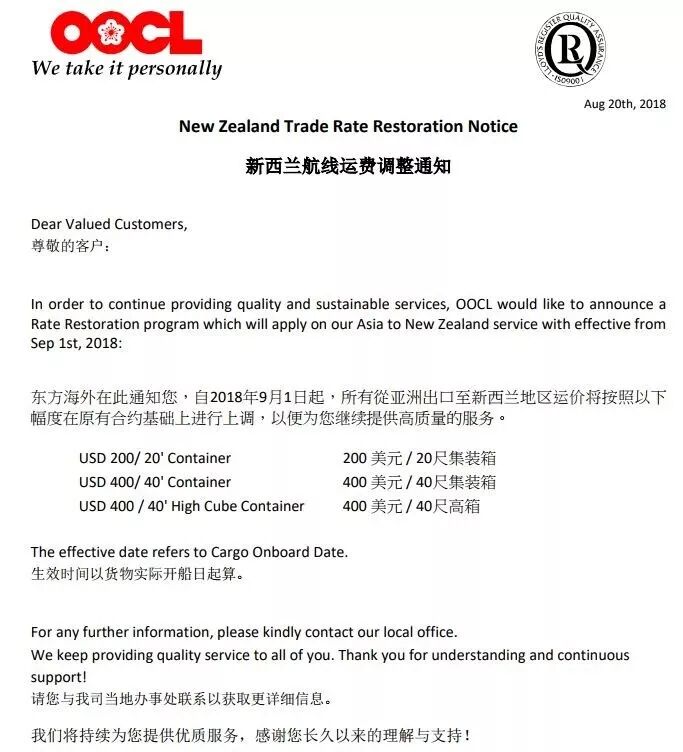 自2018年9月1日起,所有从亚洲出口至新西兰地区运价将按照以下幅度在原有合约基础上进行上调,一遍为您继续提供高质量的服务。