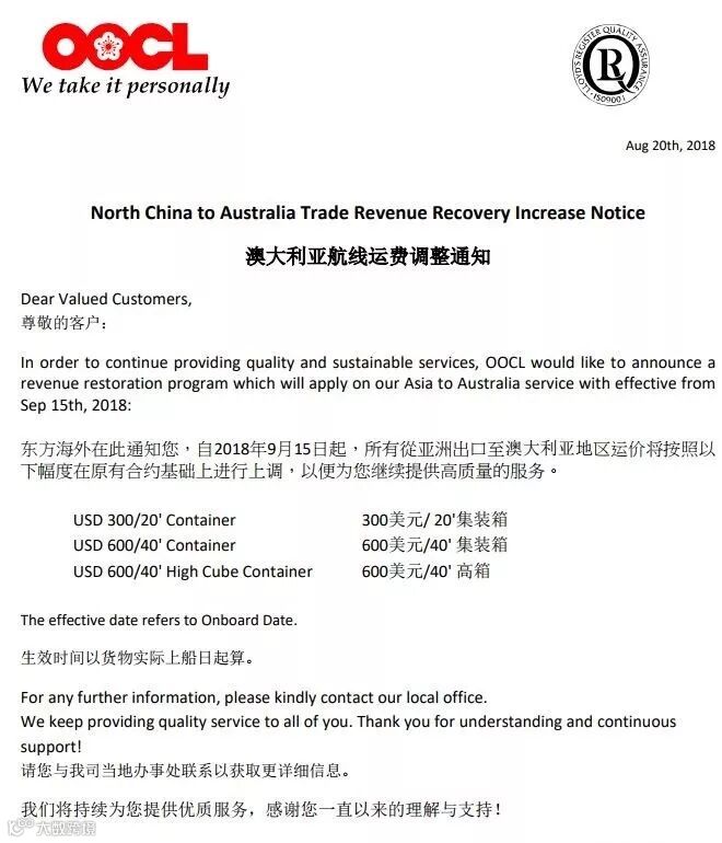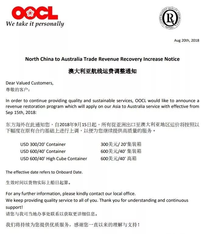 自2018年9月15日起,所有从亚洲出口至澳大利亚地区运价将按照以下幅度在原有合约基础上进行上调,一遍为您继续提供高质量的服务。