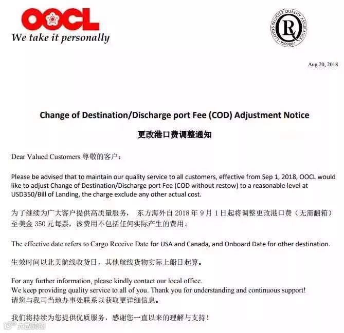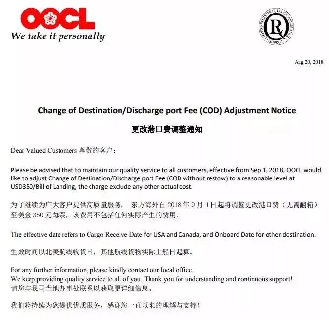 为了继续为广大客户提供高质量服务, 东方海外自2018年9月1日起将调整更改港口费(无需翻箱)至美金350元每票,该费用不包括任何实际产生的费用。