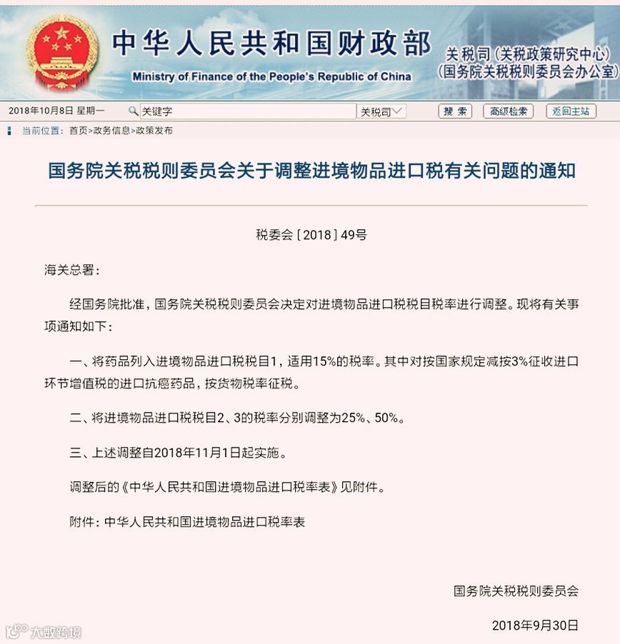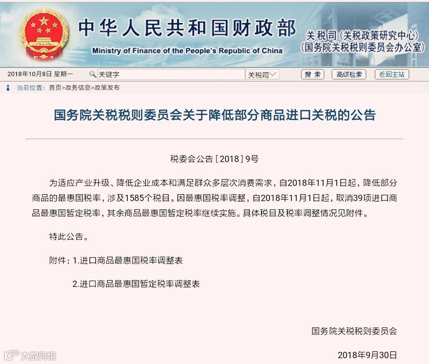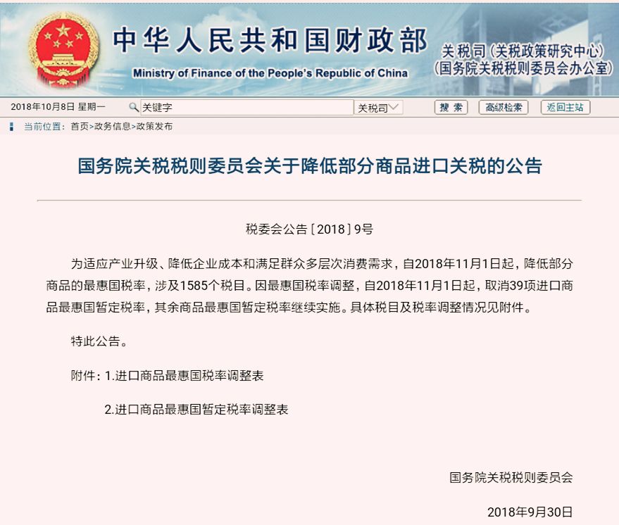 9月30日,国务院关税税则委员会发布公告,自2018年11月1日起,降低1585个税目的进口关税。此次降税涵盖了人民生产和生活所需的众多工业品等商品,平均税率由10.5%降至7.8%,平均降幅约26%。
