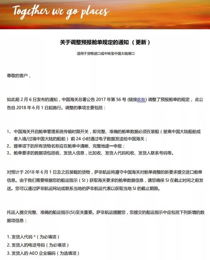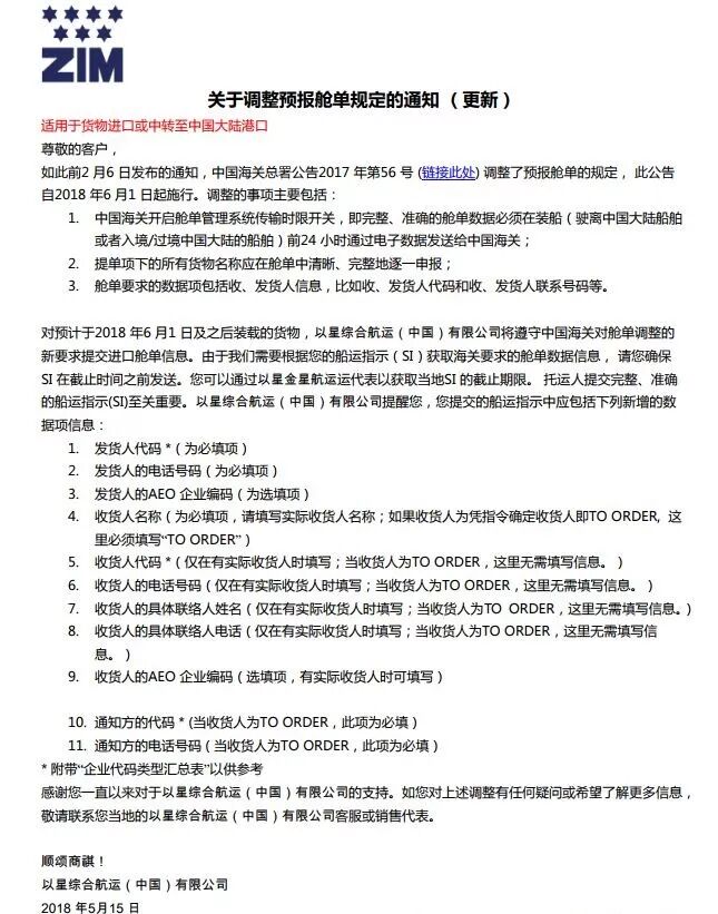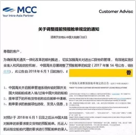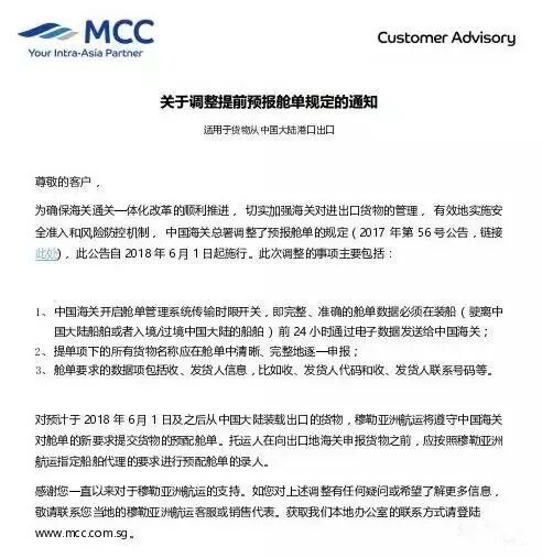 对预计于2018年6月1日及之后从中国大陆装载出口的货物,船公司将遵守中国海关对舱单的新要求提交货物的预配舱单。托运人在向出口地海关申报货物之前,应按照船公司指定船舶代理的要求进行预配舱单的录人。具体海关通知详见文末。