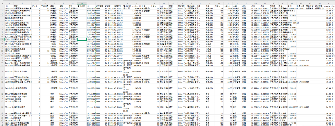 _id、商家、评论数、平均消费、类型、链接、城市、营业状态、id、城市编码、经纬度、店铺评分、营业时间、m_shop_id、分店、大类id、地址、商圈、商家图片、商家名字、大类、中类、中类id、小类id、小类、省份、经度、纬度、行政区、品牌、电话、收录时间、服务设施、特色服务、create_time