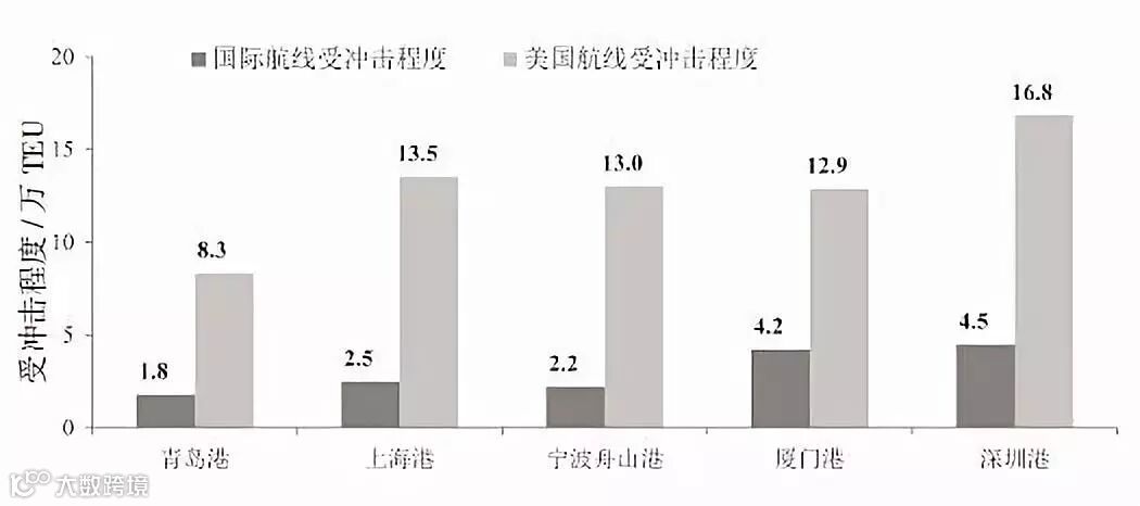 从具体港口情况看,美国航线主要集中在深圳、上海、宁波舟山、青岛、厦门等五港。结合各港目前航线结构,初步评估各港可能的受冲击程度。