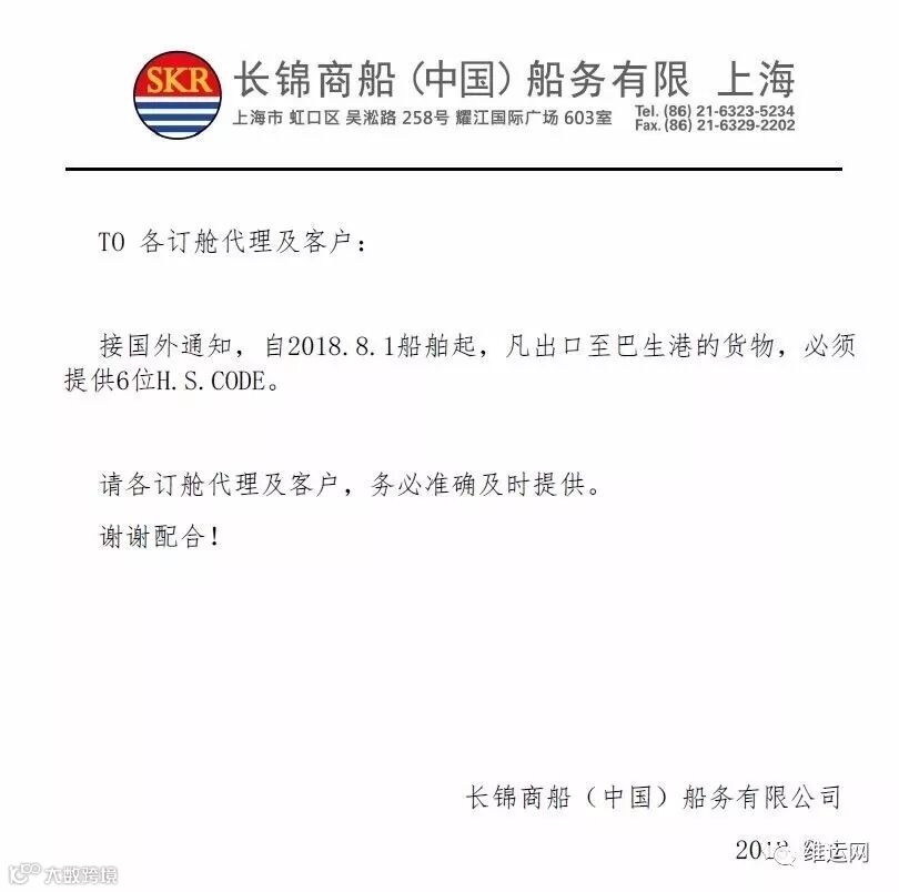 各订舱代理及客户:自2018.8.1船舶起,凡出口至巴生港的货物,必须提供6位H.S.CODE。请各订舱代理及客户,务必准确及时提供。