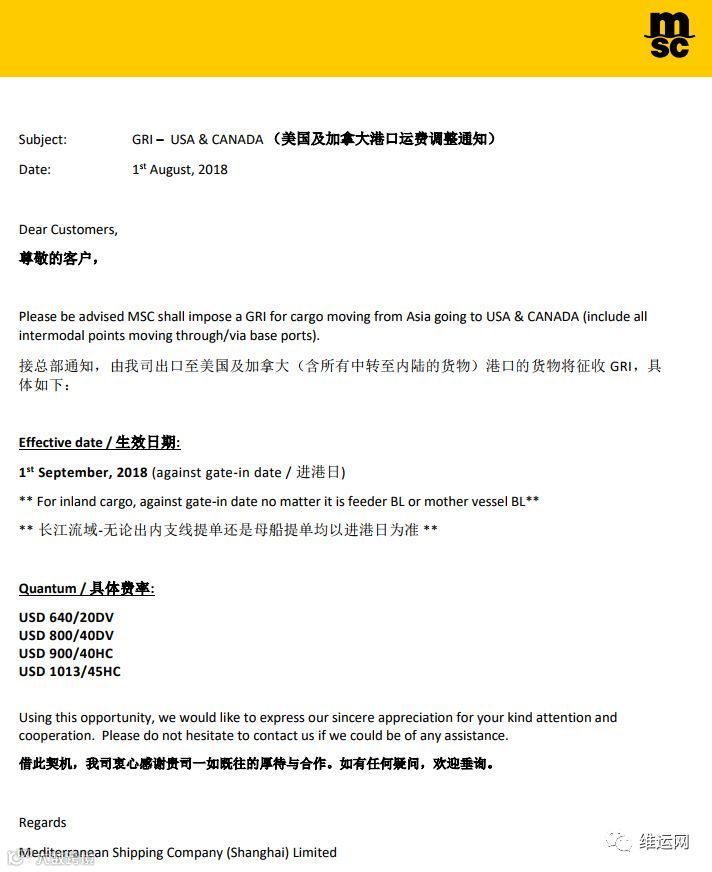 各货代/货主:从2018年09月01日起,我司美国及加拿大航线将征收GRI。