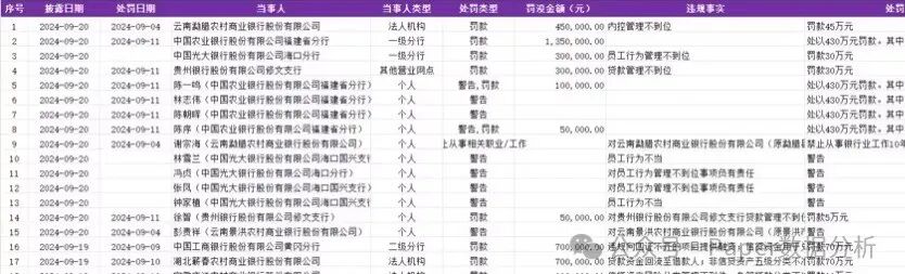 指标:披露日期、处罚日期(该指标少部分缺项)、当事人、当事人类型、处罚类型、原文、罚没金额、违规事实、处罚内容、文号、所属总行、处理机构、所属地区、信用类型、违规类型、违规事项