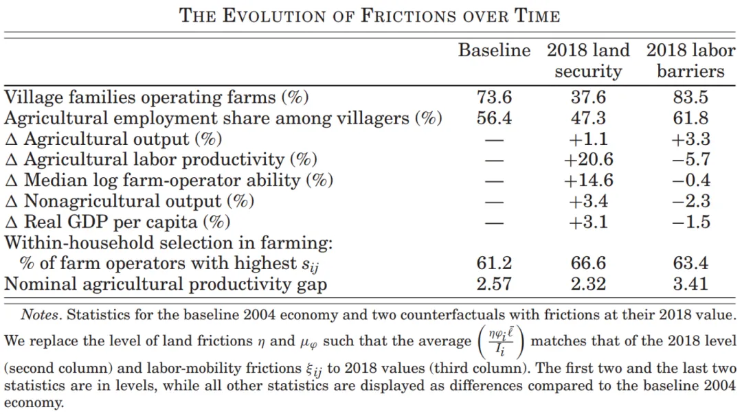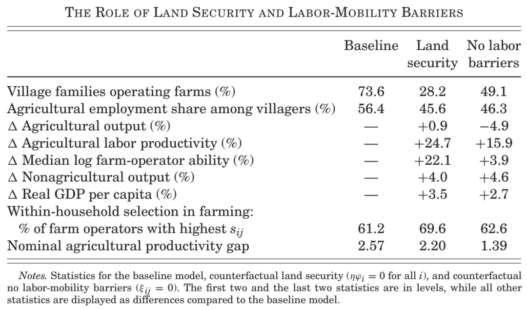 文章研究的学术贡献在于:区分了由土地不安全感产生的隐性迁移成本与其他劳动力流动障碍,并通过一个丰富的、基于实证的模型,定量评估了土地不安全感对其他劳动力流动障碍的影响,并在模型中嵌入了个体和家庭的选择。文章的研究结果表明,由于其他直接和间接劳动力流动障碍的减少,农业生产力还有进一步增长和结构变化的空间。因此,未来的政策改革可以通过降低城乡移民成本来改善居民福利。