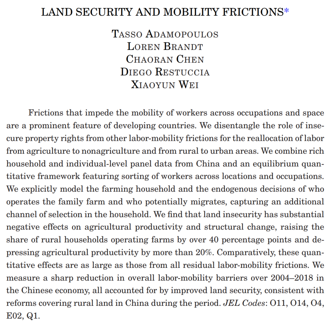 Tasso Adamopoulos, Loren Brandt, Chaoran Chen, Diego Restuccia, Xiaoyun Wei, Land Security and Mobility Frictions, The Quarterly Journal of Economics, Volume 139, Issue 3, August 2024, Pages 1941–1987,