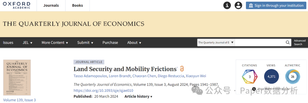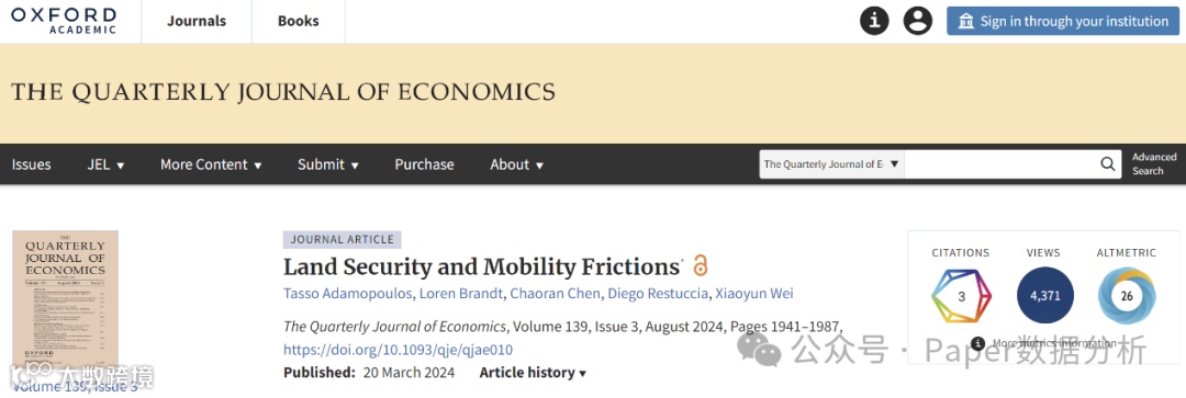 浙江大学中国农村发展研究院魏霄云博士后(合作导师:龚斌磊)与多伦多大学合作者的论文“Land Security and Labor Mobility”(土地产权确定性与劳动力流动摩擦)在经济学顶刊The Quarterly Journal of Economics(QJE)正式发表。这是浙江大学卡特学者首次在经济学Top5期刊发表论文,也是浙大农经学科建设国际一流学科的标志性成果。