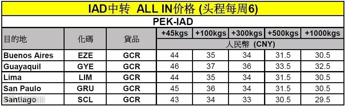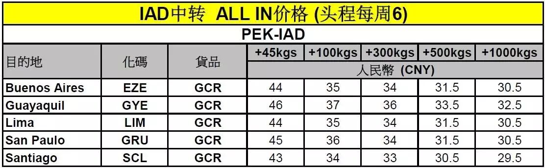 (交单时间为航班起飞前一天的下午四点前)PEK-IAD 头程每周 6