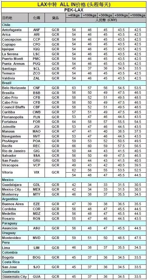(交单时间为航班起飞前一天的下午四点前)PEK-LAX 每天航班