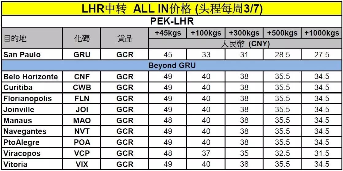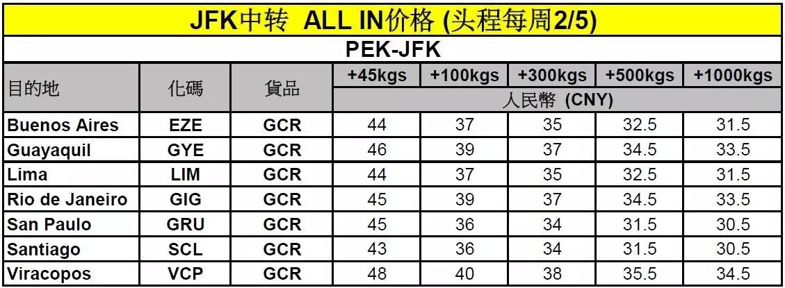 (交单时间为航班起飞前一天)PEK-JFK 头程每周 2/5