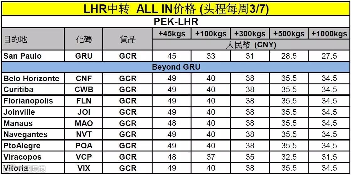 以上价格已包含燃油附加费:CNY3.0/Kg (按计费重量计算)