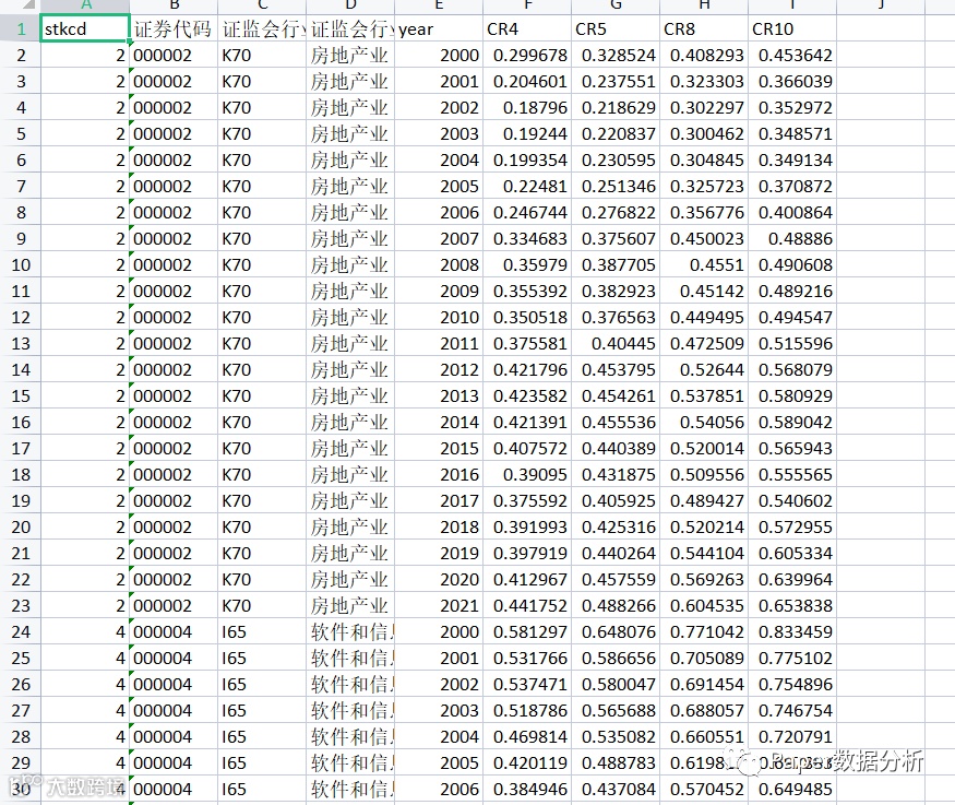行业集中度(Concentration Ratio)又称行业集中率或市场集中度(Market Concentration Rate),是指某行业的相关市场内前N家最大的企业所占市场份额(产值、产量、销售额、销售量、职工人数、资产总额等)的总和,是对整个行业的市场结构集中程度的测量指标,用来衡量企业的数目和相对规模的差异,是市场势力的重要量化指标。行业集中度是指该行业的相关市场内前N家最大的企业所占市场份额的总和。例如,CR4是指四个最大的企业占有该相关市场份额。同样,五个企业集中率(CR5)、八个企业集中率(CR8)均可以计算出来。
