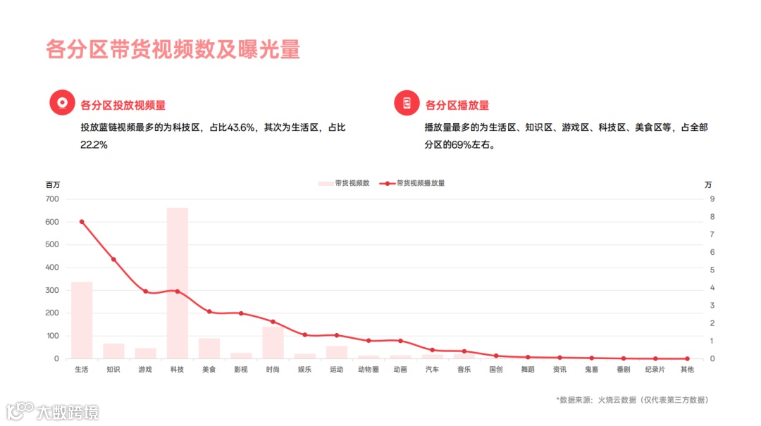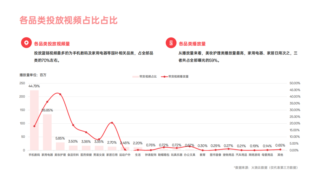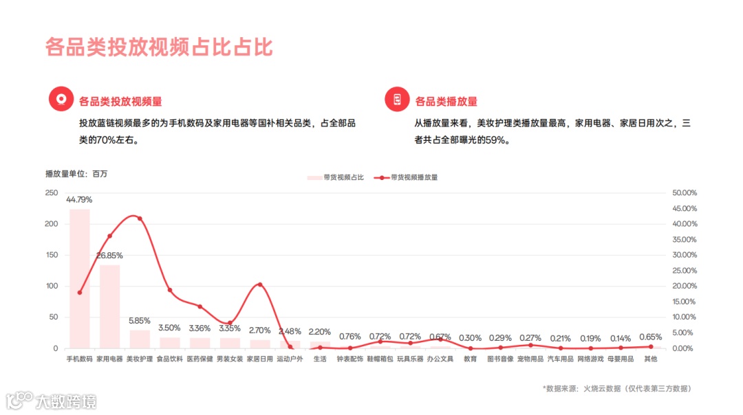 与去年同期相比,各行业的带货视频数、播放量等指标均有大幅增长,而各品类又因品类性质和品牌打法不同而展现出了不同的特点。