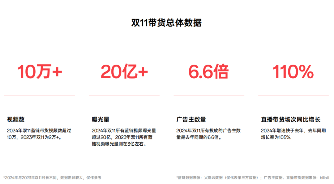 双11期间,品牌共计投放了10万+视频,获得了20亿+曝光量;投放视频数同比增长超过700%,曝光量同比增长超过400%;另外,直播场次较去年增速进一步上升,达到110%。