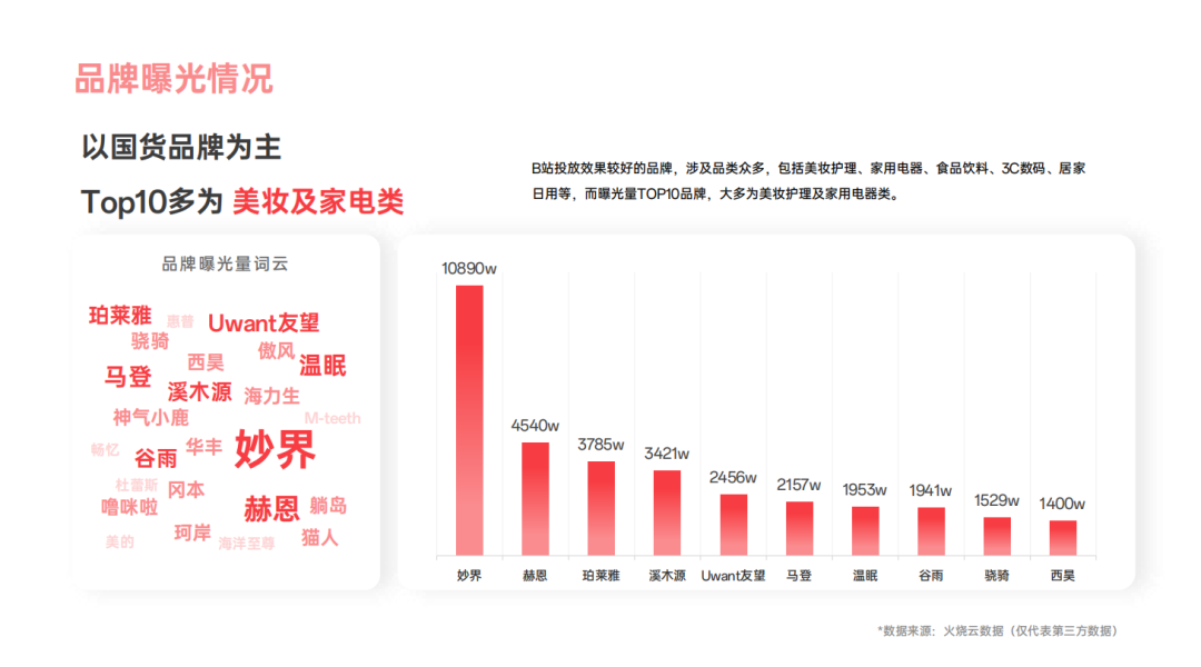 投放效果较好的品牌也大多出自这些品类,例如,妙界、赫恩、Uwant友望、马登、噜咪啦等。曝光量TOP10品牌,则以美妆护理、家用电器为主。
