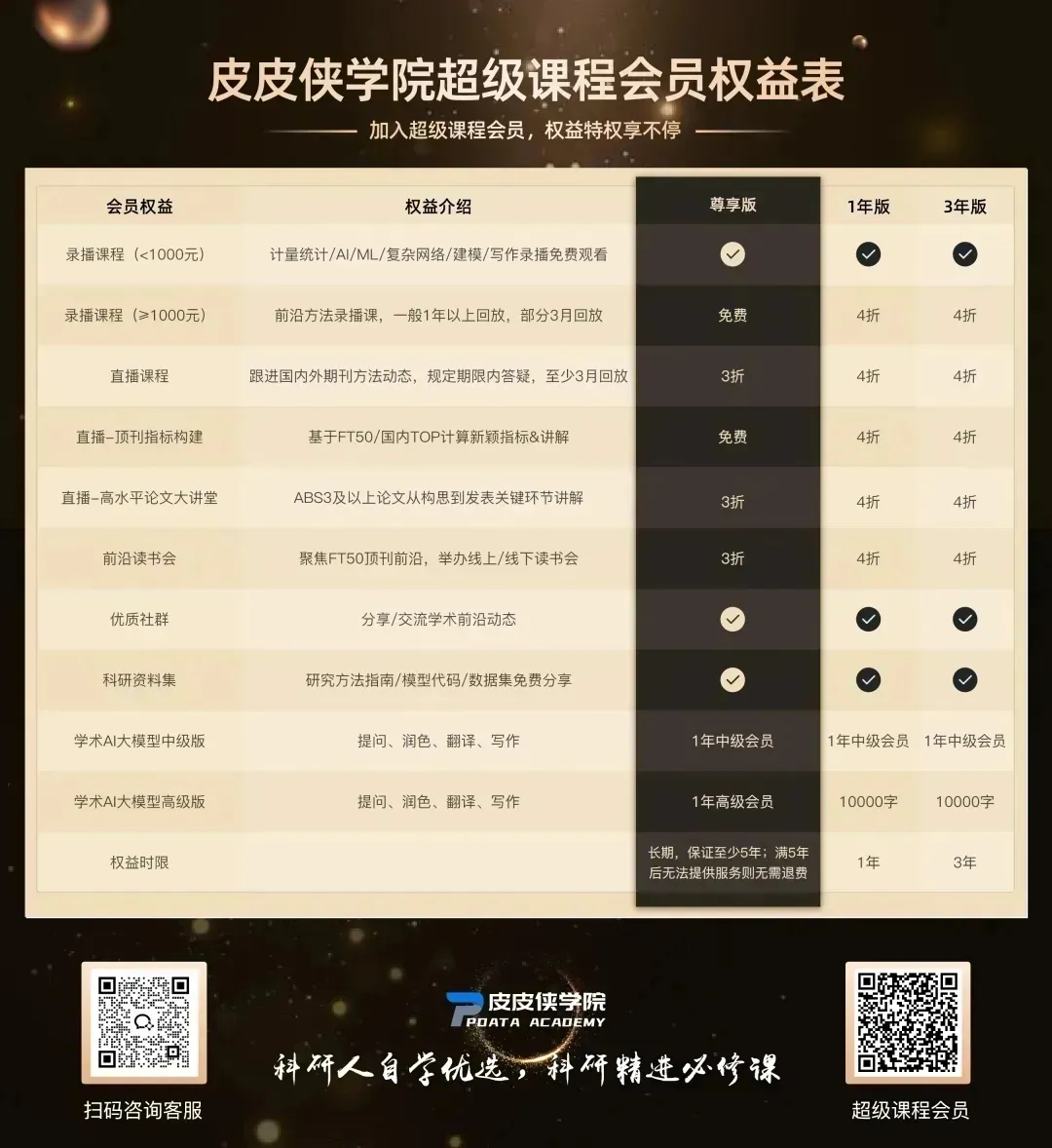 皮皮侠学院追踪FT50及领域TOP、国内TOP经管社科期刊,大语言模型Al Agent全面赋能,因果推断、统计学、计量经济学、文本分析、机器学习、人工智能、社会网络、复杂网络、网络爬虫、大规模计算、模糊评价、结构方程模型、Meta分析 、运筹优化、质性研究、案例研究、混合研究,覆盖Python、Stata、R、ArcGIS等主流软件,已服务超过上万名高校师生,欢迎报名新课及定制化培训!
