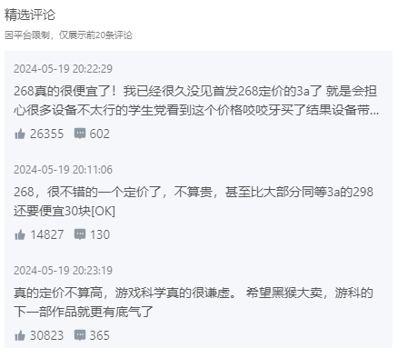 这一阶段,游戏科学仅更新了两个视频,分别宣布游戏上架wegame以及开启预购。每一个视频都不超过2分钟,却分别获得774.8万和1228.6万播放,同时还能拥有超过10%的互动率,评论基本是清一色的「买爆买爆」、「268的定价业界良心」。