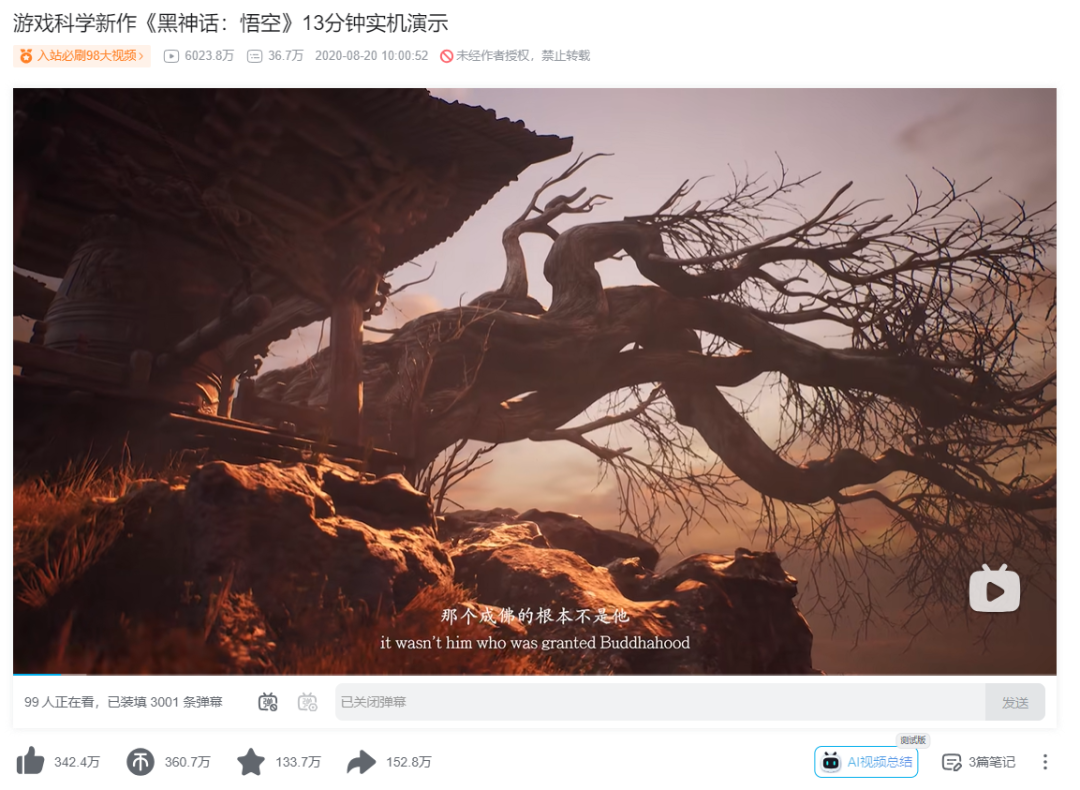 此后的宣传上,B站便成了《黑神话:悟空》的重点平台。