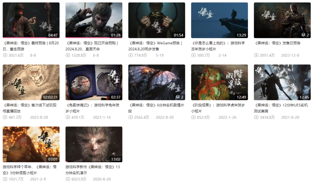 直到游戏正式上线前,游戏科学持续在B站发布实机测试和CG视频,在游戏圈层保持热度。这些视频的播放量在B站都是以百万起步,而每次实机测试视频都是千万量级。