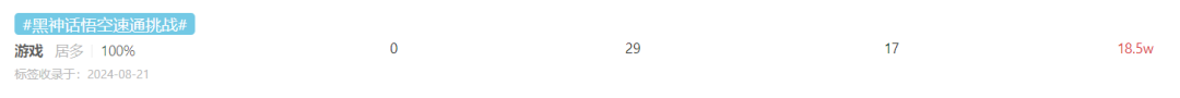 为此,B站还专门设立了《黑神话:悟空》专栏。包括持续八周的集卡挑战、征稿活动、带货视频等。截止9月11日,活动相关的话题标签共有约2.6万投稿,曝光量约4.8亿。其中,等全民皆可参与的话题占据流量大头。
