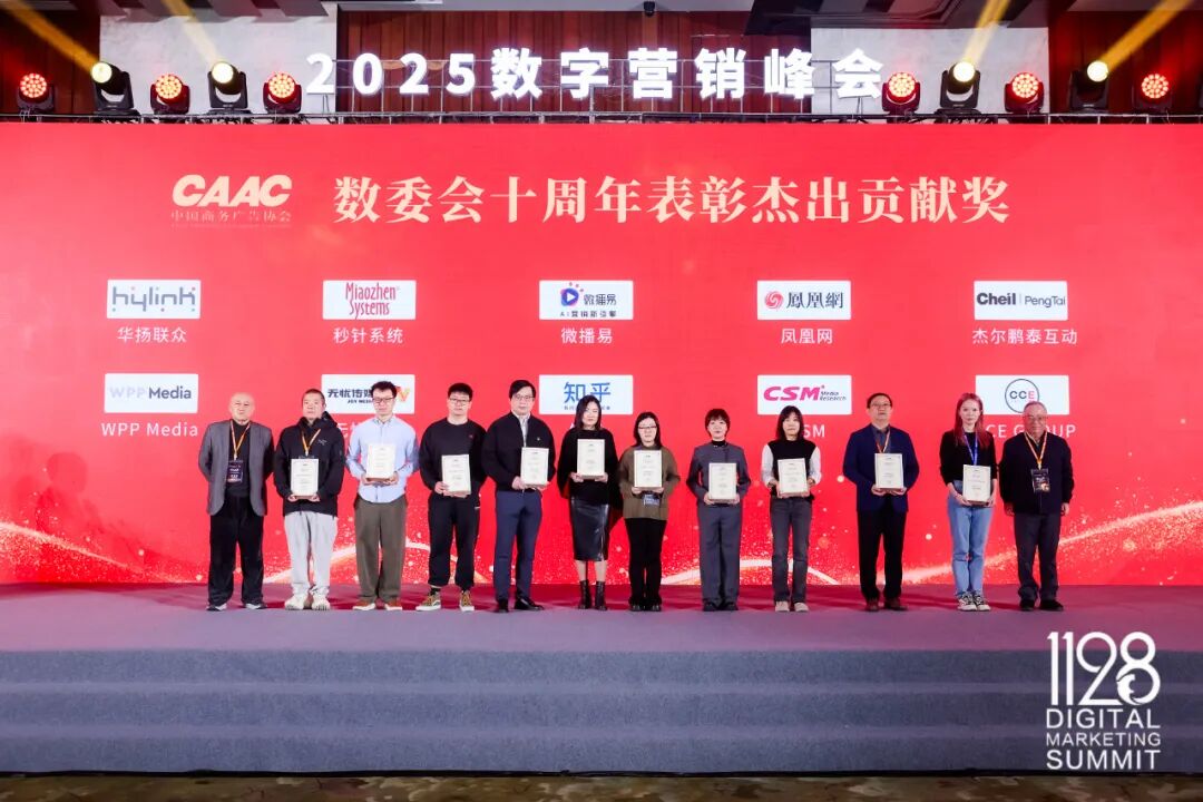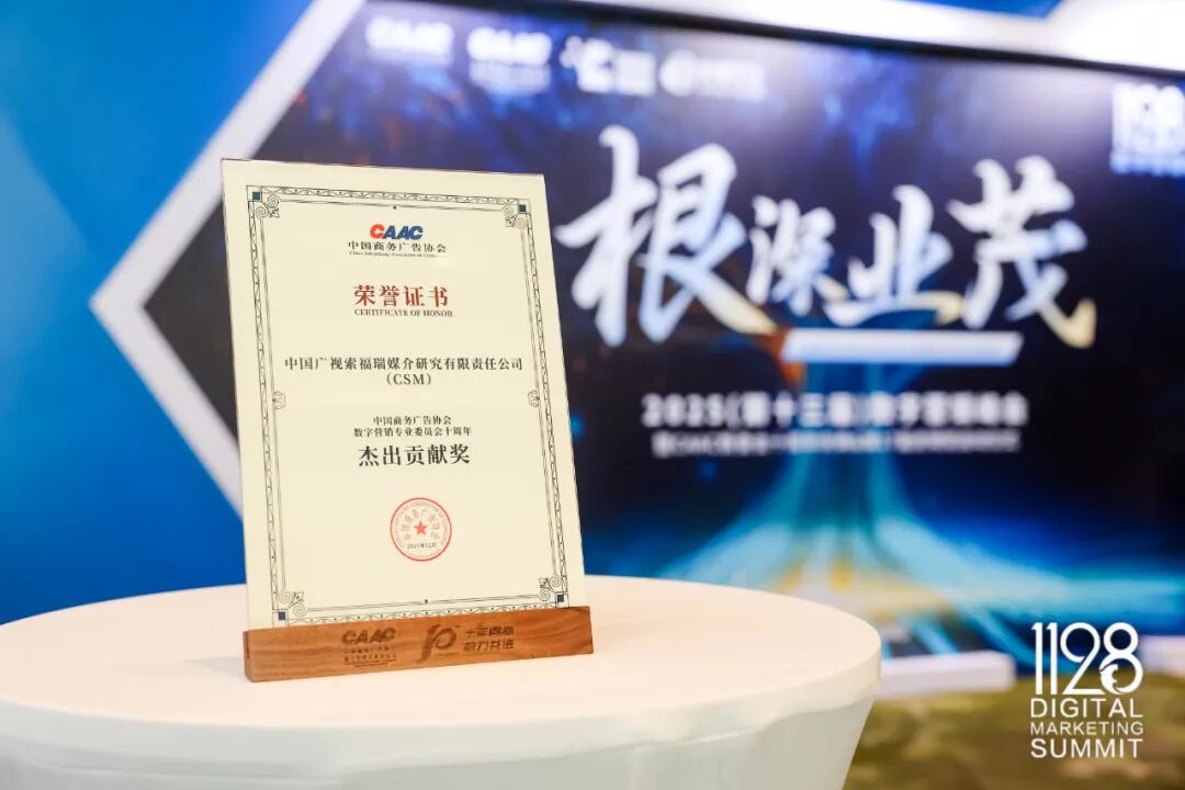 11月28日,以“根深业茂”为主题的2025(第十三届)数字营销峰会在北京举行。峰会现场,中国商务广告协会领导与行业专家共同回顾了数委会与行业共生共荣、向上生长的十年征程。现场还举行了数委会十周年表彰活动,CSM凭借长期以来在数据产品和研究服务等方面的深耕和积累,斩获中国商务广告协会数字营销专业委员会十周年杰出贡献奖,副总经理肖建兵荣获个人类杰出贡献奖和数字营销研究专家称号。