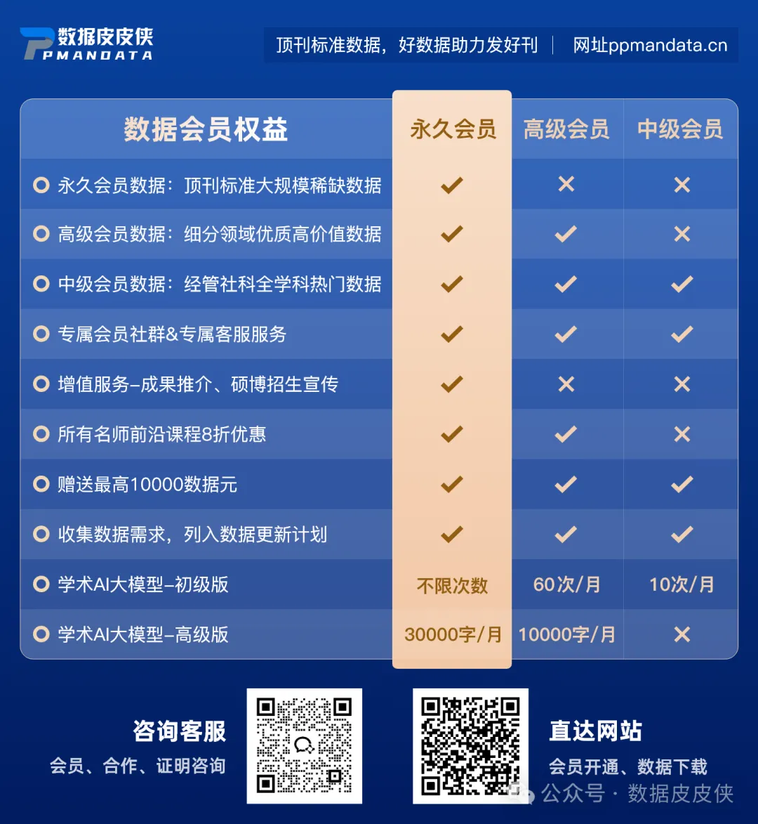 CNPaperData(简称CNPD)是立足大规模数据采集、清洗、挖掘的国家高新技术企业,借鉴Compustat、WRDS等国际知名数据库及FT50期刊专业标准,打造中国特色经济管理社会科学研究型数据库。涵盖上市公司、企业、省份、地级市、县域、高校、人物等研究对象,涵盖经济、法律、金融、政策、科技、文化、健康、环保、人口等各类热门数据。顶刊标准数据,好数据助力发好刊!获取数据地址https://www.ppmandata.cn/trade/list