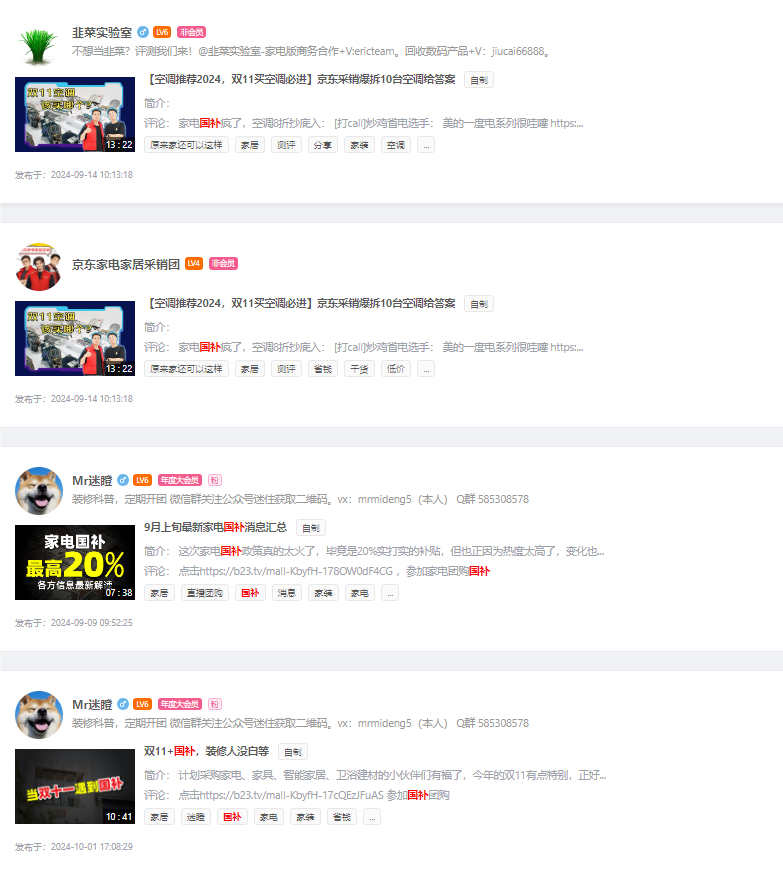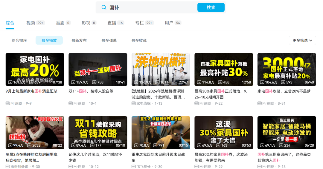 目前B站上的国补相关视频基本以产品测评、同类产品对比为主。此类视频的互动率一般能达到4%。@Mr迷瞪、@先看实验室、@韭菜评测 等较有影响力的UP主均采用这种类型。