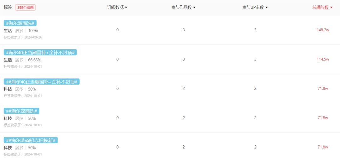 例如,近两个月,海尔已经在B站创建了289个标签,内容包括国补活动、参与活动的产品型号等。