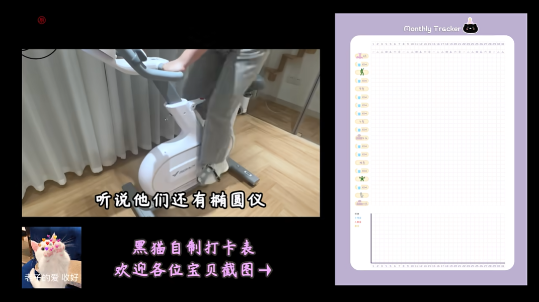 在这个带货家用健身车的视频中,黑猫记录下了自己减肥的真实经历:从一开始的拒绝运动,到被游戏吸引而去锻炼,再到跟着内置课程突破平台期,直至减肥成功。