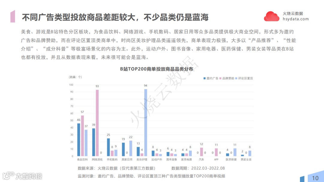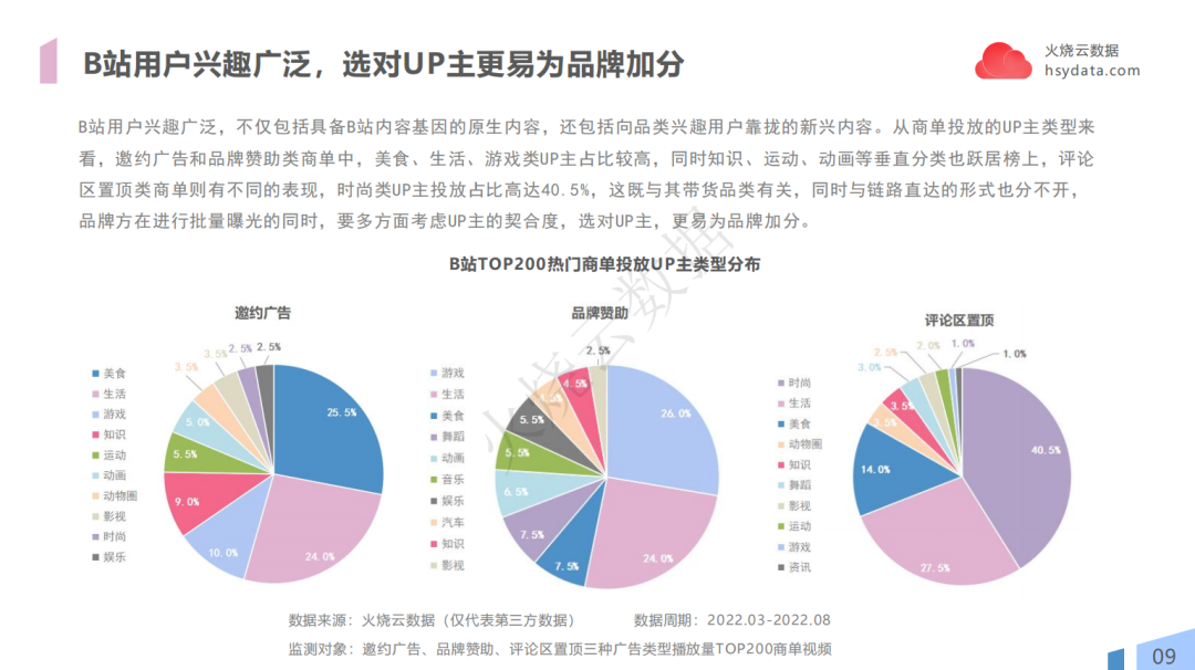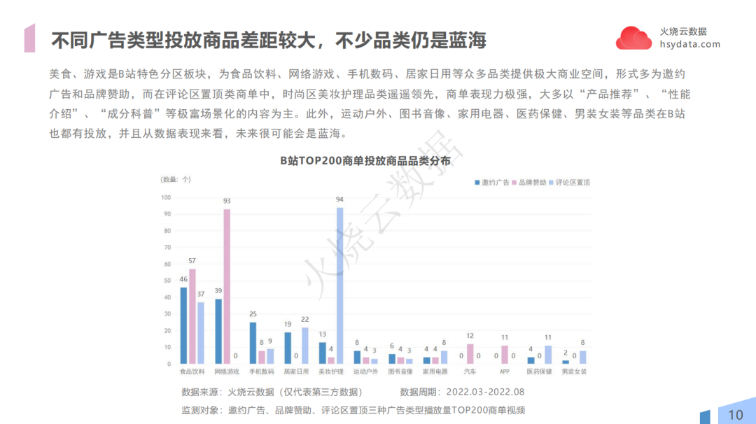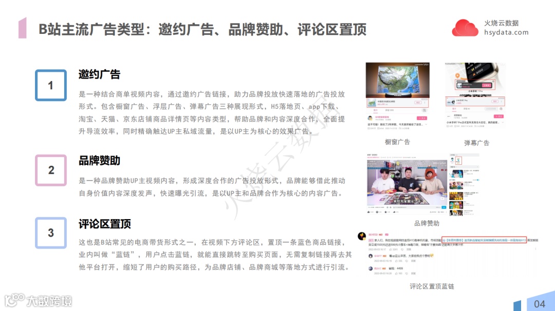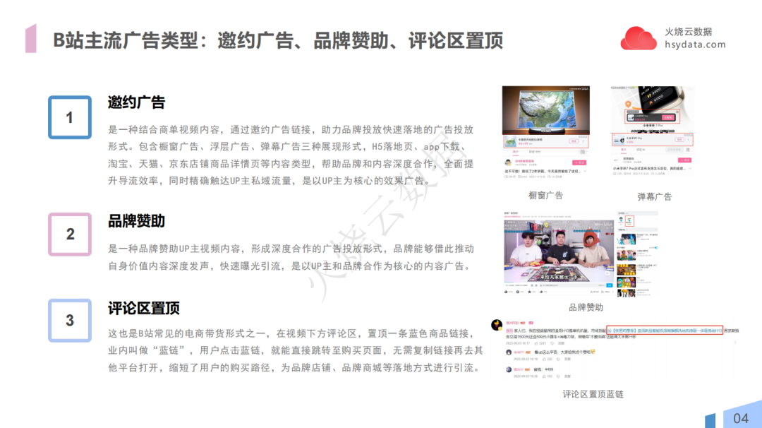 当前B站的主流广告类型有:邀约广告、品牌赞助、评论区置顶蓝链,品牌方可借此实现活动引流、私域账号加粉、产品转化等多类目标;此外,从行业角度来看,B站不止是游戏、动漫爱好者的聚集地,更是为美食、知识、时尚等多圈层人群提供内容养分,更多垂直行业机会明显。
